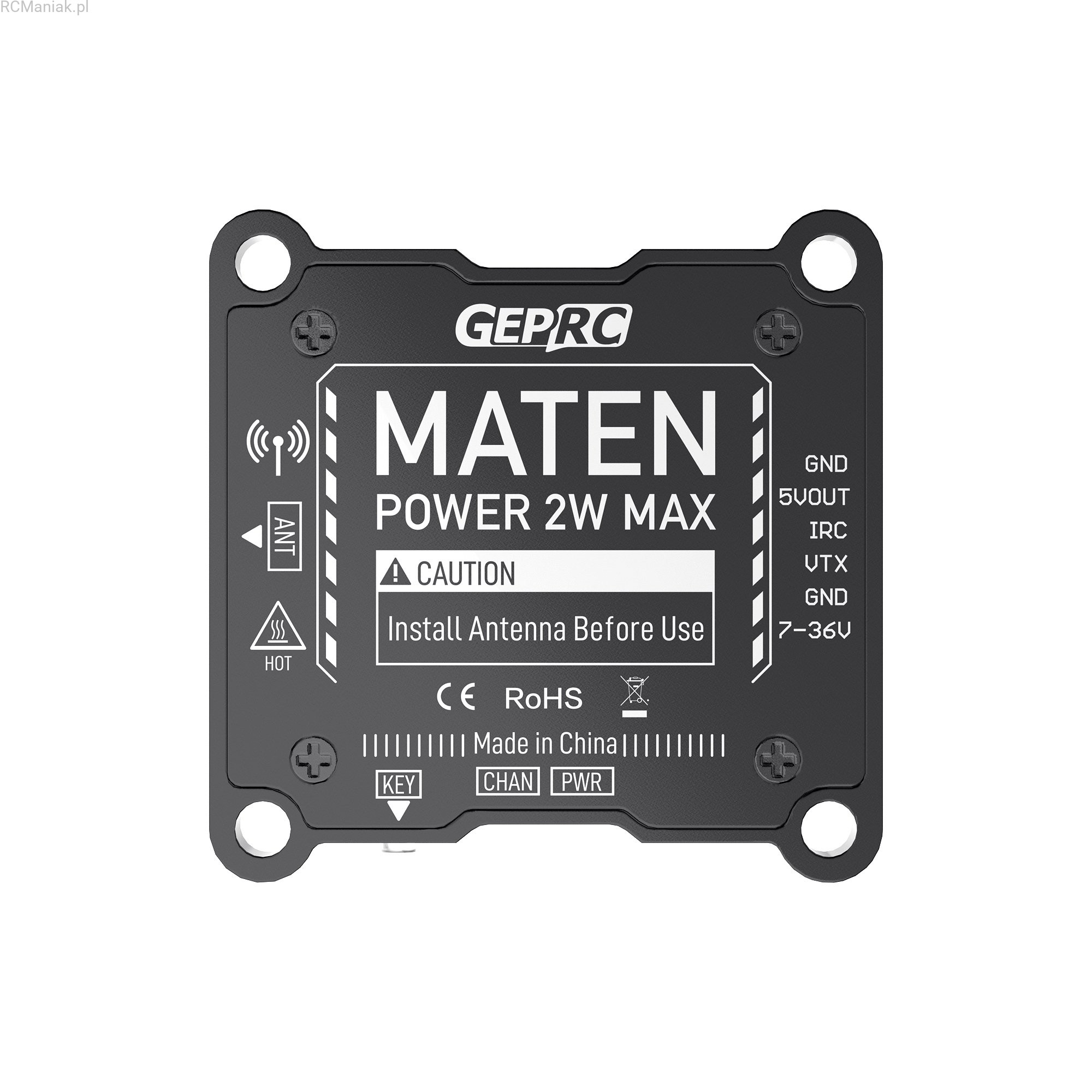 MATEN 1.2G 2W VTX, opracowany przez zespół GEPRC, to nadajnik wideo o wysokiej wydajności. Oferuje 4 rtegulowane poziomy mocy, z maksymalną do 2000mW. Zapewnia stabilny sygnał i dobrą zdolność przenikania.Wyposażony jest w obudowę CNC z wytrzymałego stopu aluminium, która wspomaga odprowadzanie ciepła. Unikalny design zapewnia większą odporność na uderzenia oraz lepszą wydajność chłodzenia.