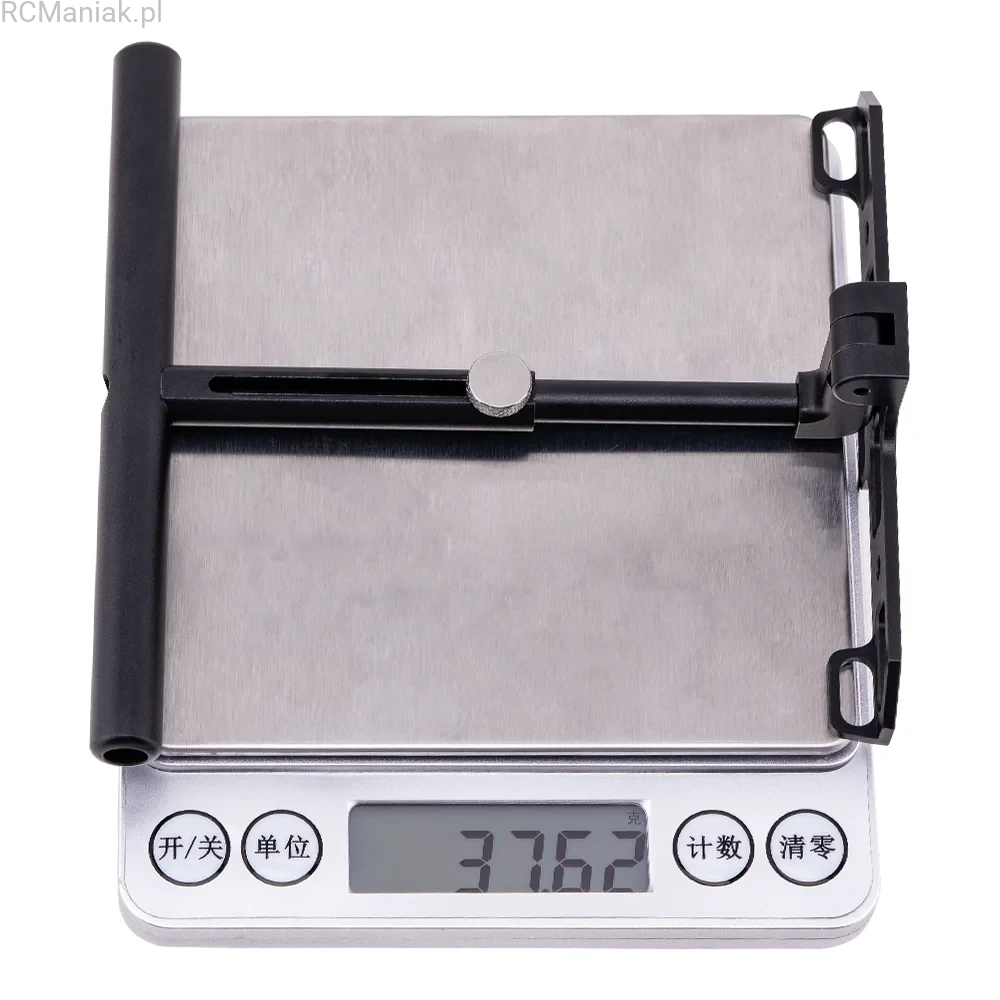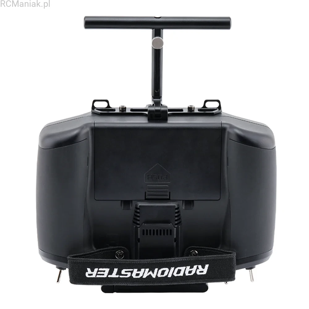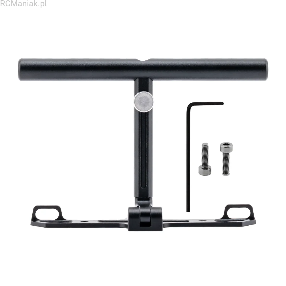 The aluminum Multi-stand for the GX12 radio controller provides stable support against your abdomen, enhancing control and comfort. Featuring dual neck strap connection points, it positions the radio comfortably. When folded, the Multi-stand doubles as a convenient tabletop stand.