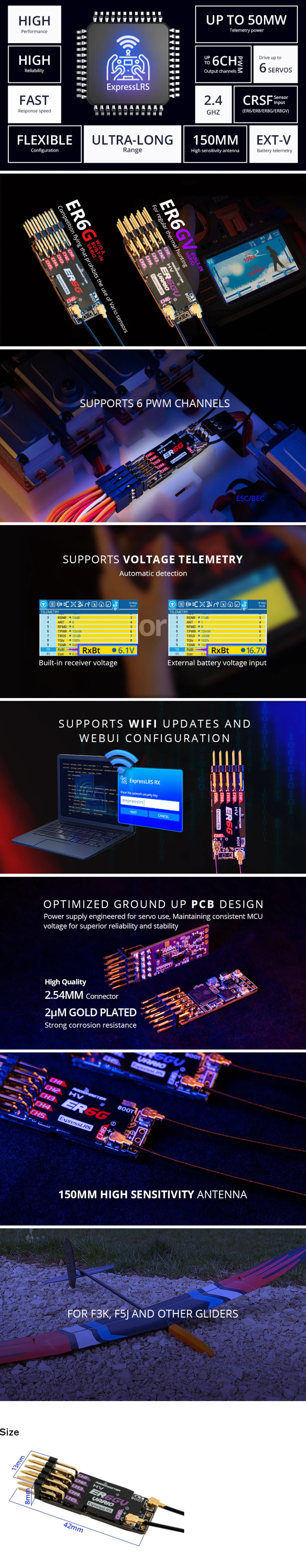 The ER6G & ER6GV receiver have been specially designed for glider pilots who require a compact and slim receiver. It can drive up to 6 servos and has built-in receiver voltage telemetry and flight battery telemetry with the ability to automatically detect which voltage input to use. Both ER6G & ER6GV feature a dual-antenna with telemetry power up to 50mw and can work stably with a 1S Lipo receiver battery.