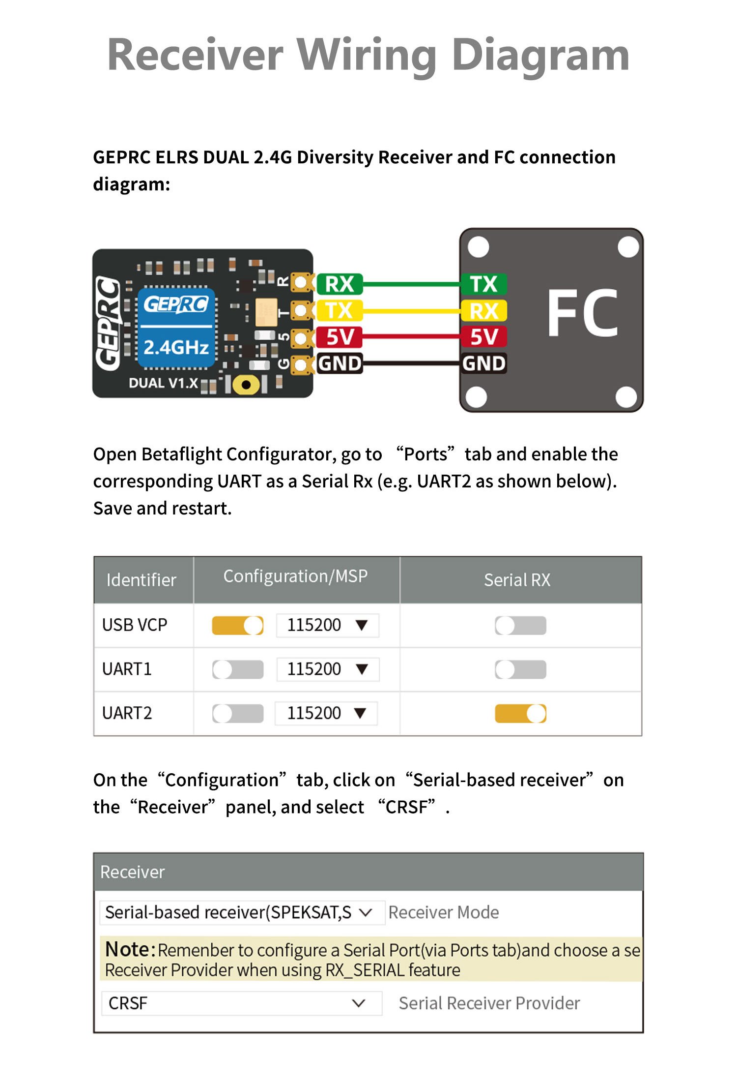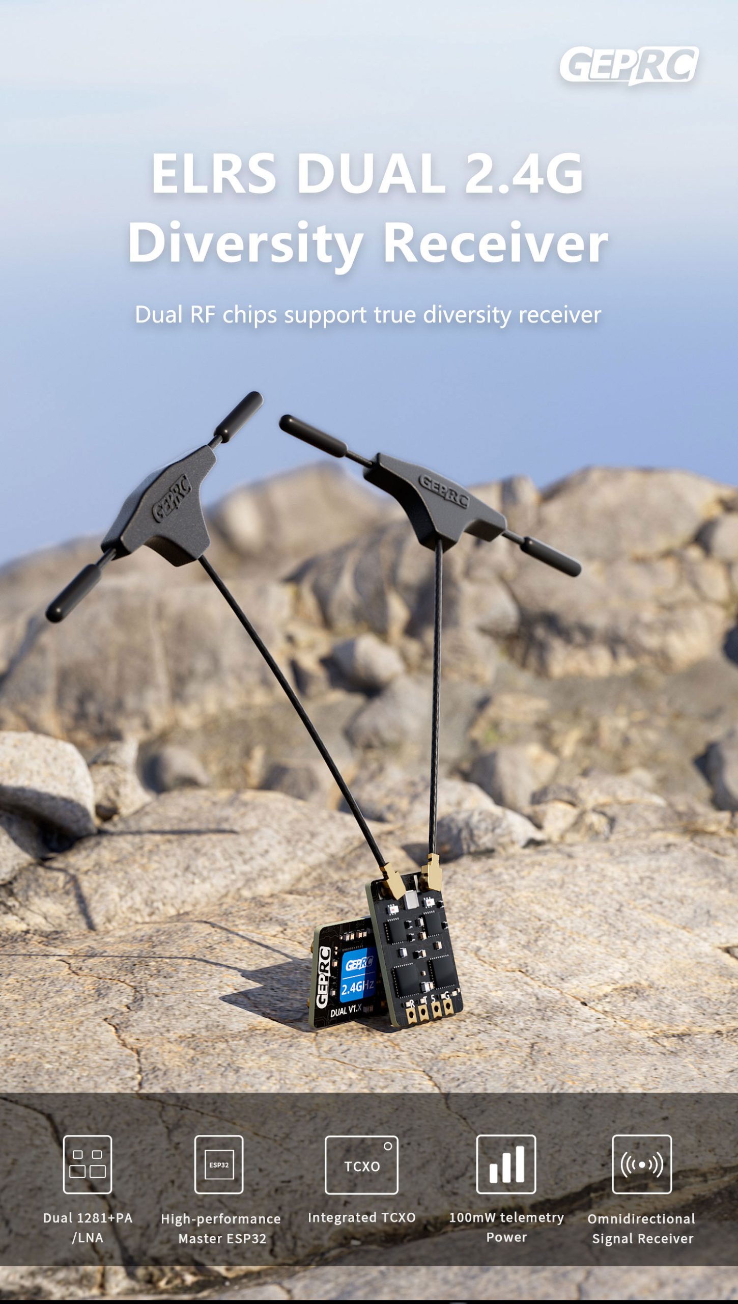 GEPRC ELRS DUAL 2.4G Diversity Receiver is a new generation of true dual-antenna diversity receiver system based on the ExpressLRS open source project. ExpressLRS features long range operation, low latency, maximum 1000Hz refresh rate, and low price.