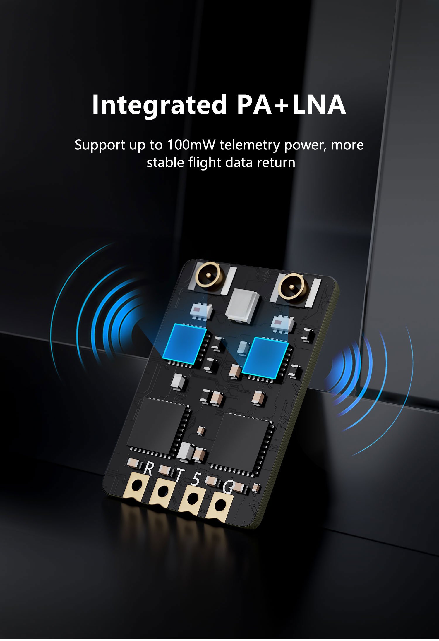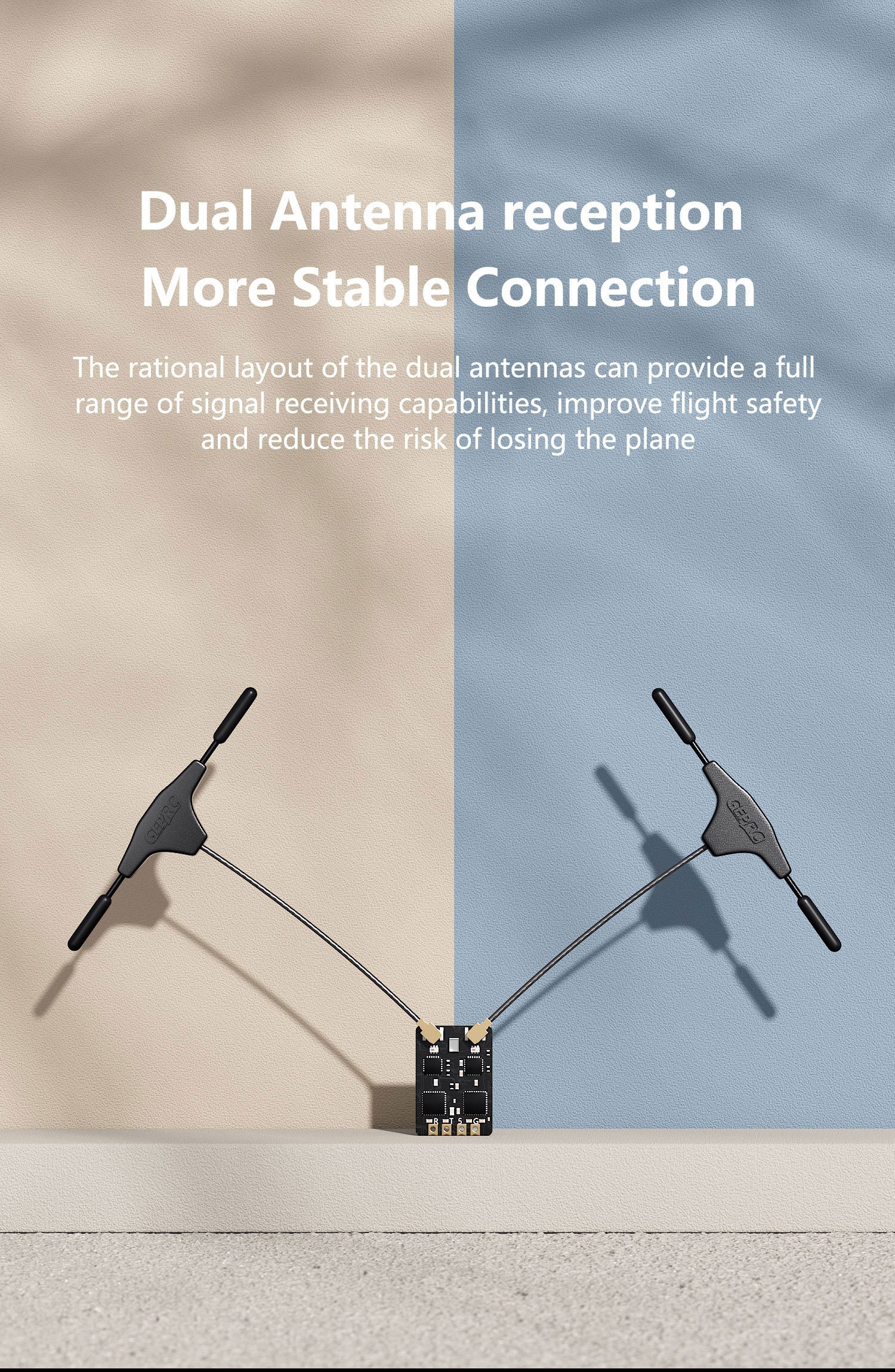 The ELRS DUAL 2.4G Diversity Receiver has a reasonable placement of dual antennas for wider signal reception and more stable connection than ordinary single antenna receiver systems. It uses a TCXO temperature compensated crystal oscillator to avoid frequency shifts caused by temperature changes and the telemetry power is up to 100mW.