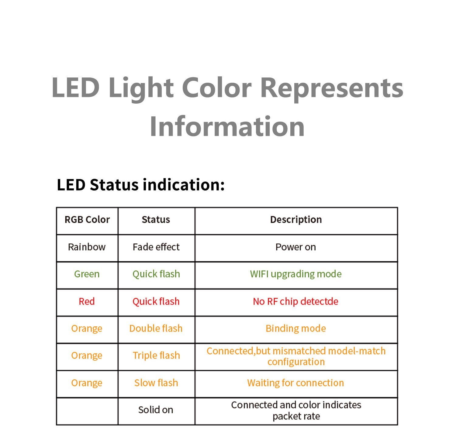 - Configure remote control or transmitter module to bind with the receiver; If the receiver RGB indicator is solid on, this indicates that the receiver has successfully bound.
