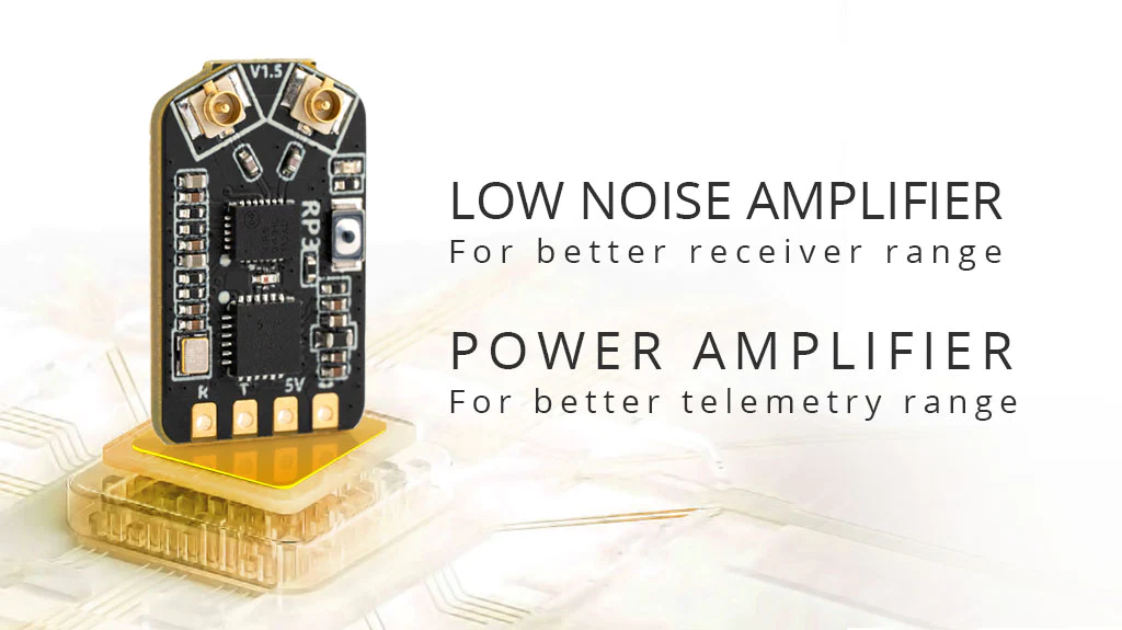 The RP3 receiver features a Skyworks SE2431L providing an LNA for improved receiver performance, a PA providing up to 100mW of telemetry performance and antenna switching for antenna diversity.