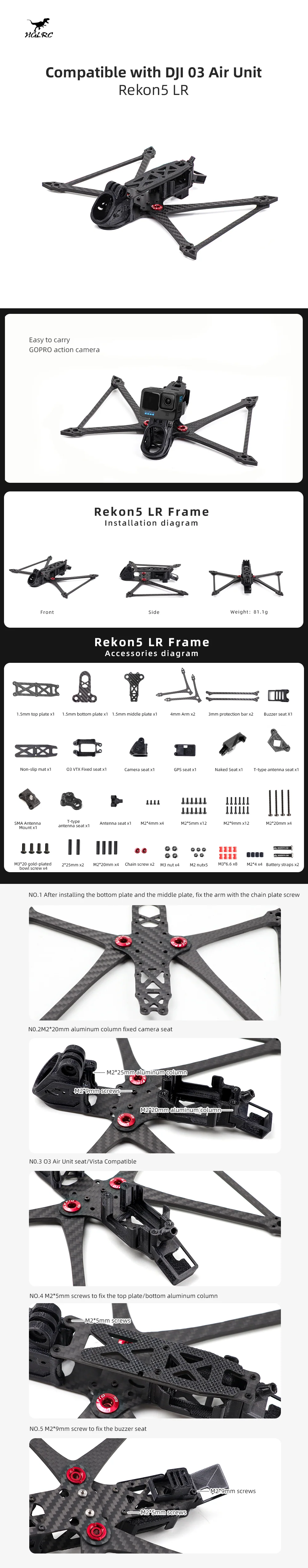 The Rekon 5 features an innovative frame design featuring one-piece front and rear arms locked by 7050 chainring screw. The screws are used to create a strong and rigid part in the center part of the frame, which locks the arms and decouples the force from the rest of the frame,This enables the use of very light M2 screws and thin carbon plates in the rest of the frame, reducing overall weight for max efficiency, and most importantly the chainring screws can take more torque and are not as often used by M2 or M3 screws Occurs easily cracked or peeled off,The design of the front TPU camera seat and the Naked gopro bracket has also received a lot of attention. Since the arms are extended backwards and the drone head is partially exposed, the dead cat frame is prone to collisions at the nose of the drone, but the Rekon 5 It will be flexible to fly.