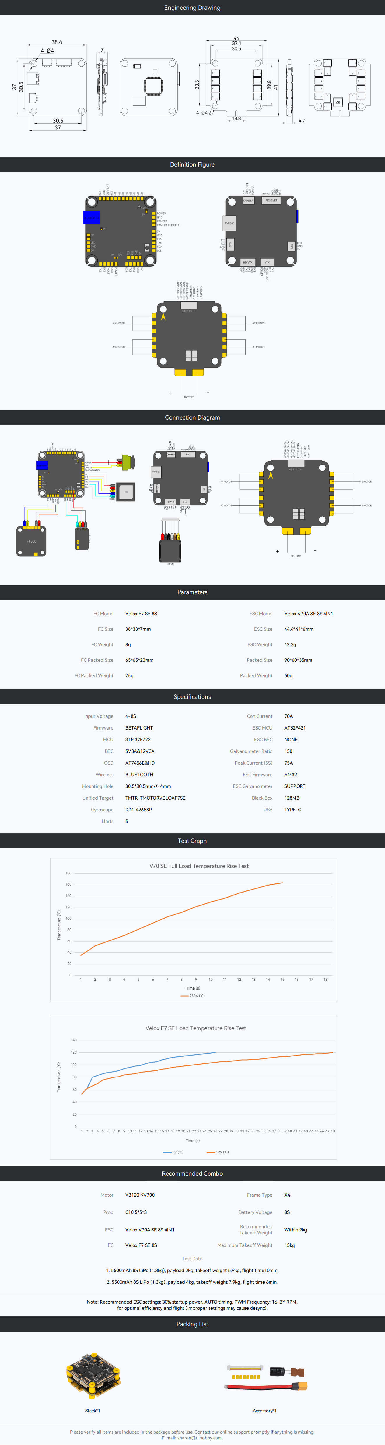 Designed with durability, safety, and performance in mind, the Velox V70A F7 SE 8S FPV Stack is an ideal choice for pilots upgrading from 6S systems or building next-generation high-power FPV drones