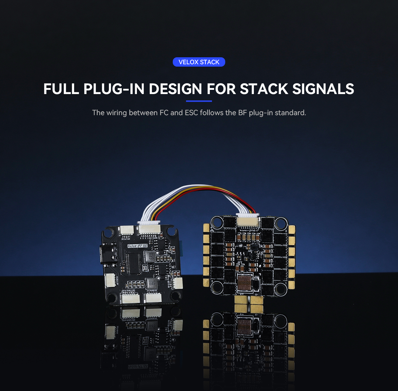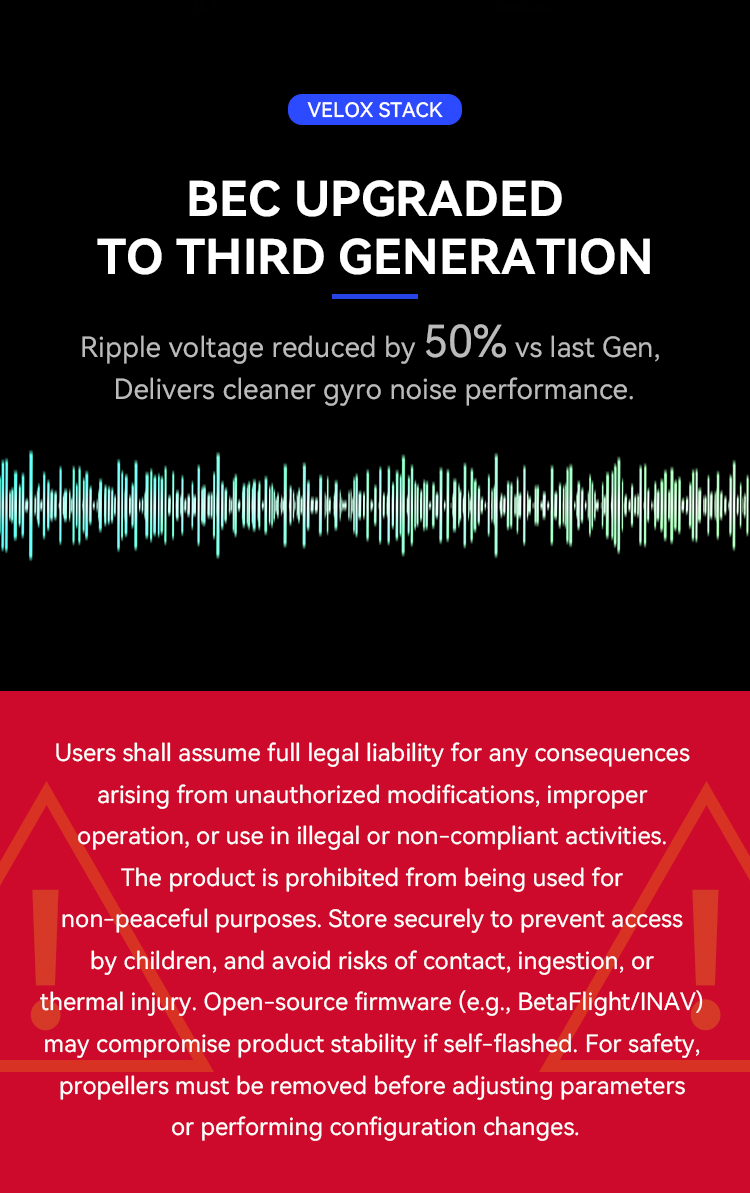 The Velox stack features a full plug-in design following Betaflight standards, allowing for fast, clean, and reliable installation between the FC and ESC. With built-in Bluetooth and onboard Blackbox, pilots can easily tune, configure, and analyze flight data without additional hardware.